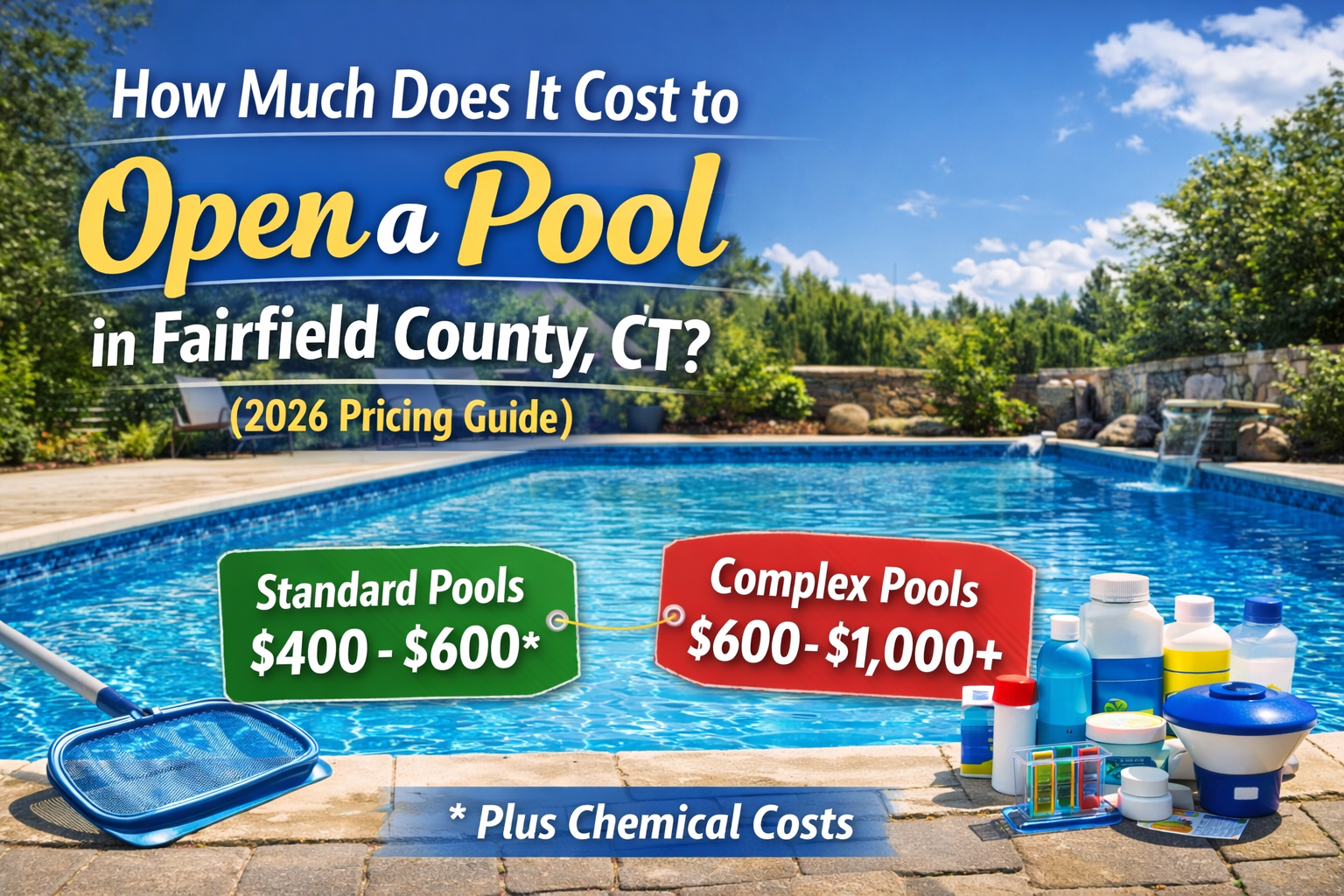How Much Does It Cost to Open a Pool in Fairfield County, CT? Opening your pool the right way in spring is one of the most important steps in protecting your equipment and getting your pool swim-ready faster. One of the first questions homeowners ask is: “How much does a pool opening cost in Fairfield County?” The honest answer is: it depends on your pool type, complexity, and water condition. Below is a full breakdown so you know exactly what to expect — including why chemicals are priced separately. Average Pool Opening Costs in Fairfield County Most pool openings fall into one of two categories: standard (normal) pools and complex pools. Standard (Normal) Pools Typical Opening Cost (labor only): $400 – $600 Standard pools are straightforward and quicker to open. Usually includes: Removing and folding the winter cover Reinstalling plugs and fittings Reconnecting pump and filter System startup Basic inspection for leaks or freeze damage Common features: One pump and one filter No attached spa No water features Traditional chlorine system Easy equipment access ⏱️ Most standard pools take 1–2 hours to open if there are no issues. Complex Pools Typical Opening Cost (labor only): $600 – $1,000+ Complex pools require more time, testing, and experience. Pools are considered complex if they have: Multiple pumps or filters Attached or spillover spas Heaters (gas or heat pump) Saltwater systems Automation systems Waterfalls, deck jets, bubblers, or laminars In-floor cleaning systems Large or irregular shapes Tight or difficult equipment access ⏱️ Complex openings can take 2–4+ hours and may require multiple visits. ⚠️ Important: Pool Opening Cost Does NOT Include Chemicals most of the time. The pool opening service and chemicals are priced separately. This keeps pricing fair and transparent — a clean pool shouldn’t pay the same chemical cost as a green one. Chemical Costs Chemical cost depends on: Pool size Water condition How long the pool sat closed Sun exposure and debris Typical Chemical Cost Ranges: Clear or slightly cloudy water: $100 – $200 Light green water: $200 – $300 Dark green or black water: $300 – $500+ Chemicals may include: Shock Chlorine Algaecide Stabilizer pH and alkalinity adjusters Clarifiers or flocculants (if needed) Green pools often require multiple treatments over several days, especially early in the season. Green Water Makes Any Pool More Complex Even a standard pool becomes more labor-intensive if it opens green. A green pool may require: Extra chemicals Filter cleanings Extended pump run times Return visits This is why opening earlier in the spring usually saves money. When Should You Open Your Pool in Fairfield County? The ideal time to open your pool is April to early May. Opening early: Prevents algae growth Reduces chemical usage Makes cleanup easier Gets you swimming sooner Waiting too long often results in: Green water Higher chemical costs Longer cleanup time DIY vs Professional Pool Opening Some homeowners open their pools themselves, but mistakes can be costly. Common DIY risks include: Broken or missing plugs Air locks that damage pumps Undetected freeze cracks Improper chemical balancing A professional opening ensures: Equipment is protected Issues are caught early The pool clears faster What Should You Budget? For most Fairfield County homeowners: Standard pool: $600 – $850 total Complex pool: $800 – $1,200+ total (depending on chemicals and water condition) Final Thoughts A proper pool opening is more than just turning the system on, it’s about protecting your investment and setting the tone for the entire season. Knowing whether your pool is standard or complex, and understanding how chemical costs factor in, helps avoid surprises and keeps expectations clear from day one. If you’re looking for reliable, professional pool service in Fairfield County, CT, we’re here to help and happy to answer any questions about your pool.